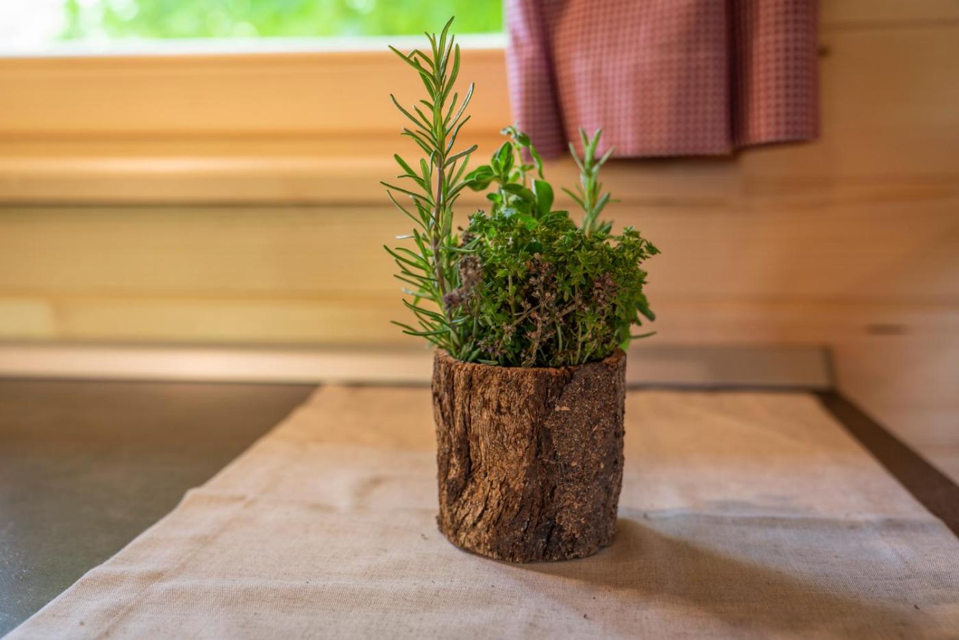 Holiday Home. This holiday home has a stovetop, kitchen and seating area. The bathroom is outside the room, and it is shared with the other campers and guests.